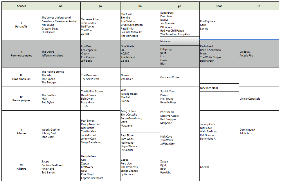 Ces catégories désignent le degré de lucidité et de cohérence avec lequel l’artiste propose son œuvre : I. Grands naïfs, 2. Paumés complets, 3. Gros branleurs, 4. Bons cyniques, 5. Adultes, 6. Ailleurs…