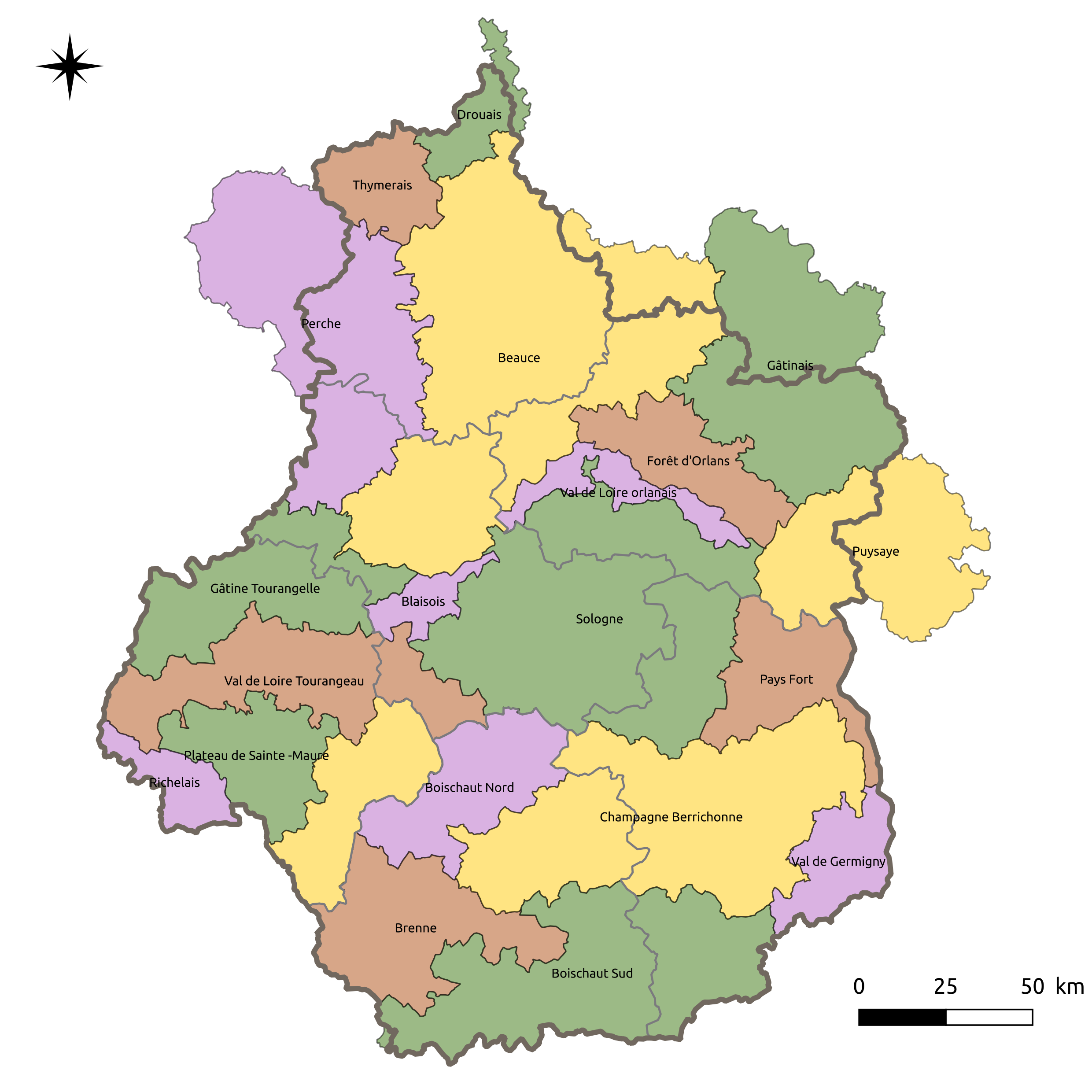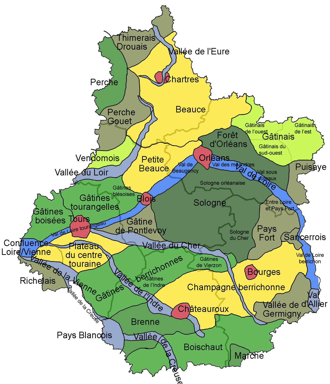 On note quelques différences (mais minimes : à part l’individuation des préfectures et des vallées, la division de certaines régions en unités plus petites, Gâtines, Beauce, Perche, il n’y a pas d’unité proprement nouvelle, sauf le Blancois, semble-t-il une subdivision du val de Creuse, et le Sancerrois, subdivision du Pays Fort, et surtout la Marche, venue de la Creuse ; le Val d’Allier peut venir lécher le sud est de la région) mais on retrouve les unités essentielles (la coïncidence des couleurs est due au pur hasard). Surtout, ce qu’il convient de noter, c’est que certains terroirs débordent les limites administratives (en noir épais, la région, en gris le département).