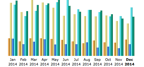 Près de 62000 visites (+14% par rapport à 2013), et 22000 visiteurs uniques en 2014 (+10%), avec tout ce que ça implique de robots, de non-lectures, etc. Je passe sur ces points techniques. 170000 pages vues (+0,1%) et près de 655000 hits (+29%). On s’en fout, mais tout de même 22,3 Go de bande passante occupée !